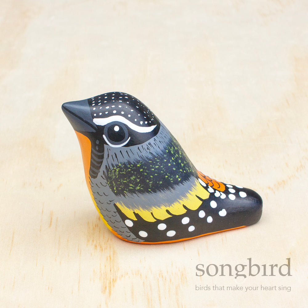 These pardalotes are truly precious - a petite bird which feels at home high atop the dense eucalypt canopies throughout eastern and southern Australia. A favourite for both our customers and artisans because of their colour and fine spotted detail.